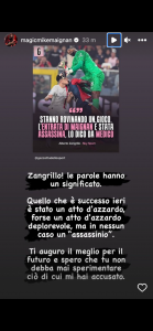 “Zangrillo! Le parole hanno un significato. Quello che è successo ieri è stato un atto d’azzardo, forse un atto d’azzardo deplorevole, ma in nessun caso un “assassinio”. Ti auguro il meglio per il futuro e spero che tu non debba mai sperimentare ciò di cui mi hai accusato”.