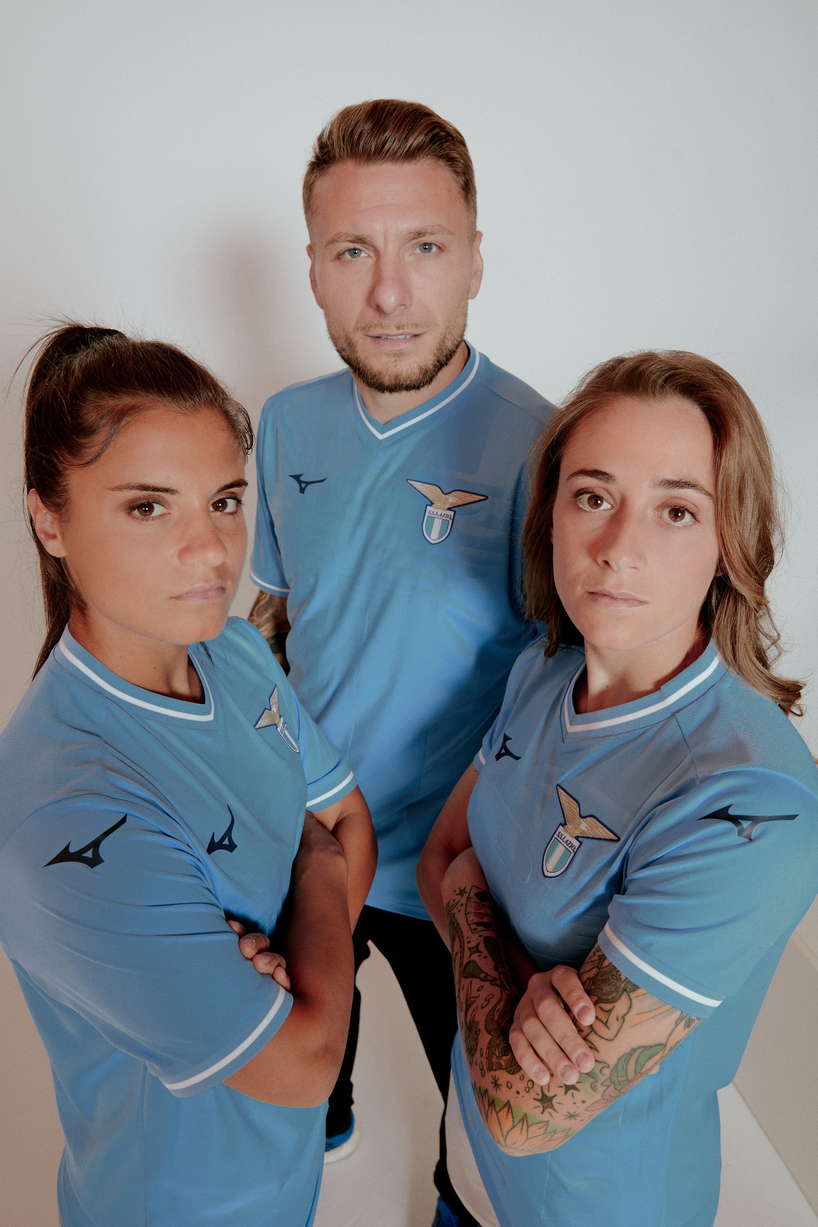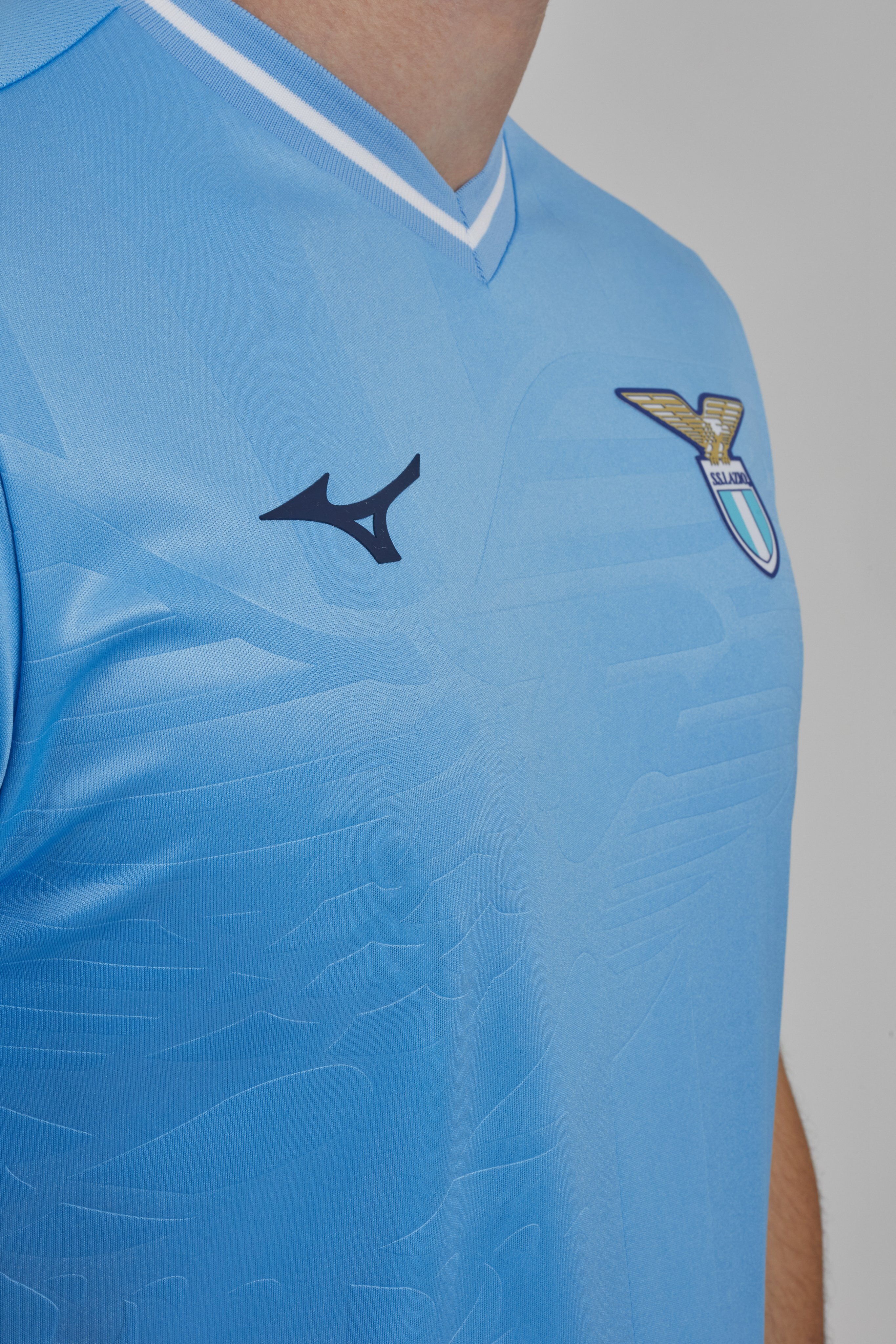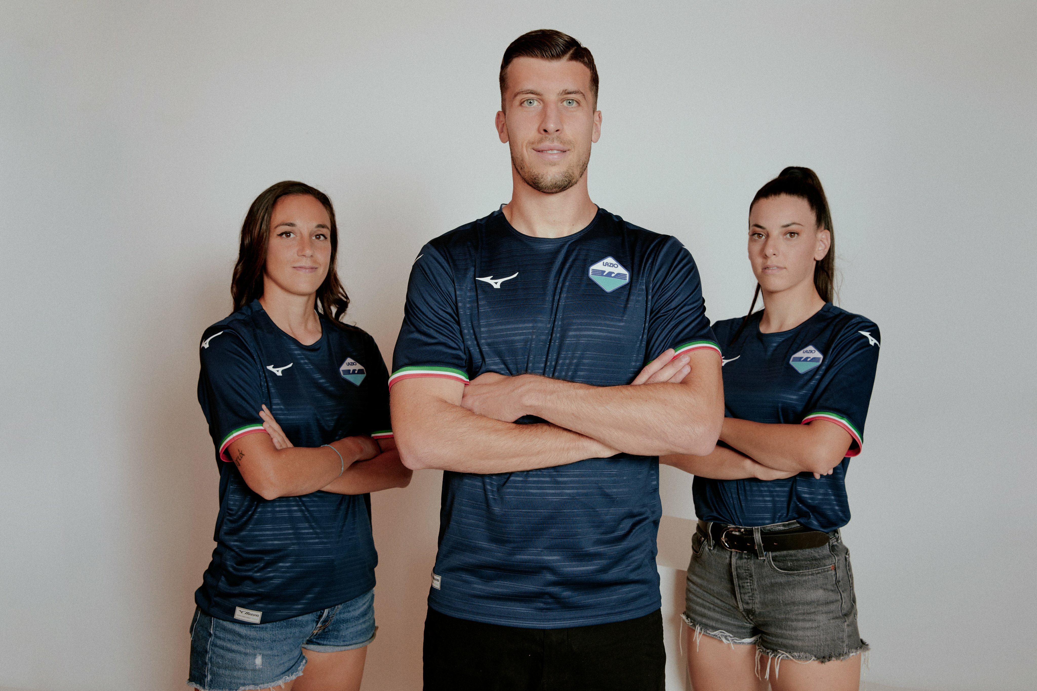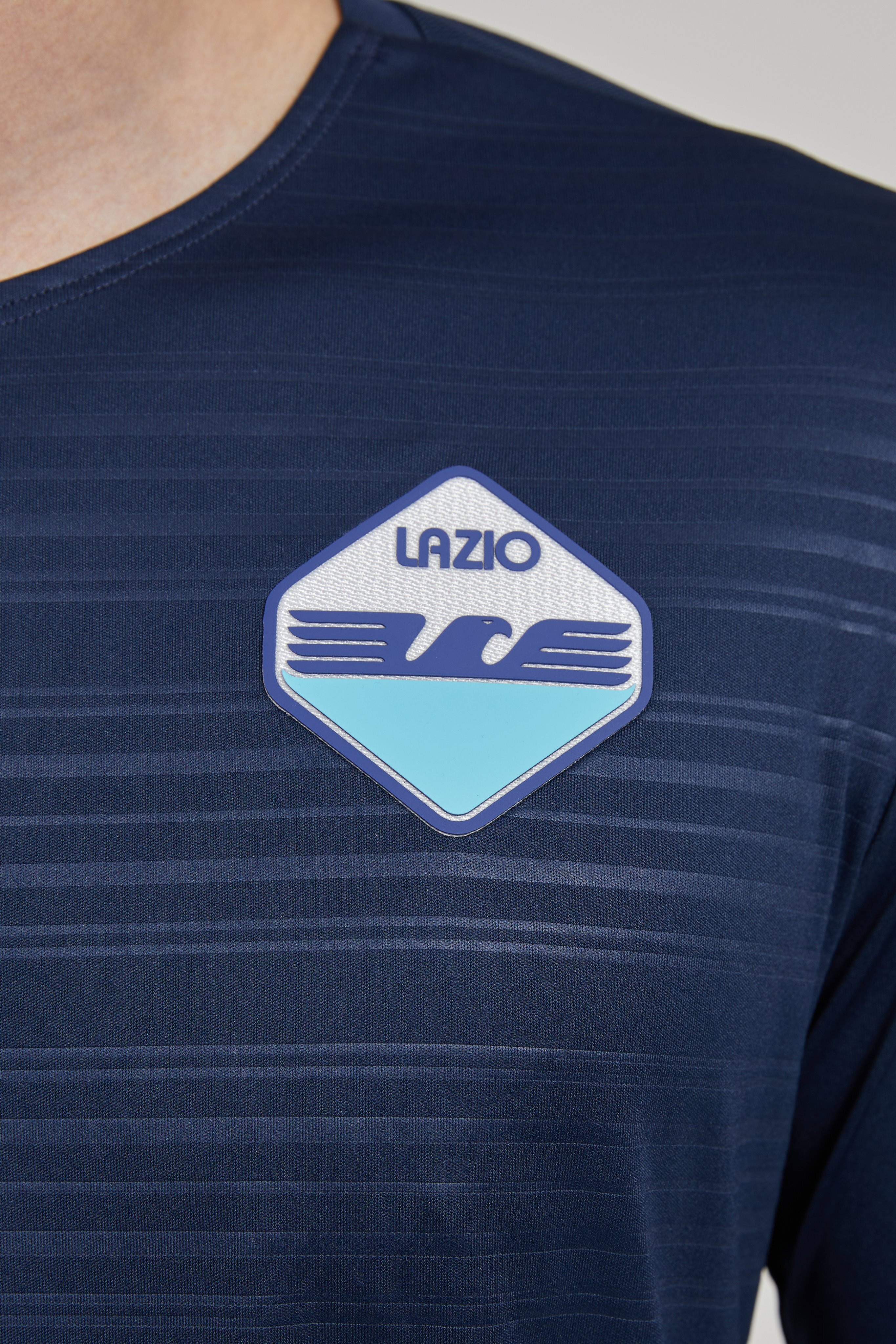 Sulla divisa da trasferta bande tricolori sui bordi delle maniche per omaggiare la prima Lazio scudettata della storia e logo vecchio stampo. Sulla prima, invece, il logo attuale. Di seguito le foto.