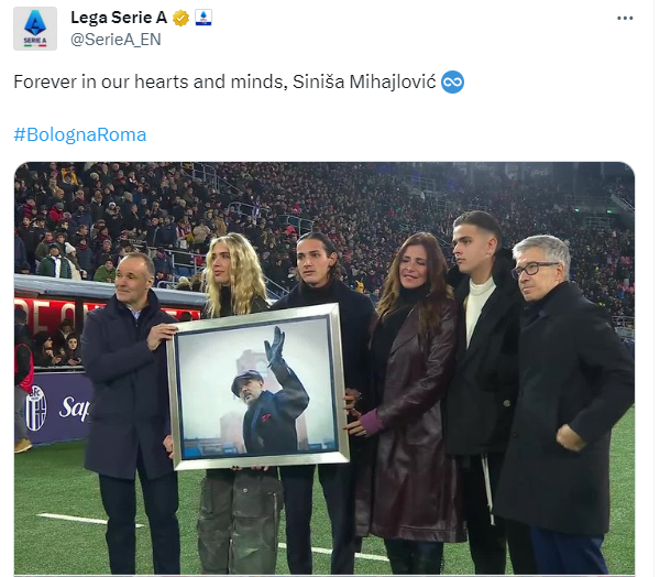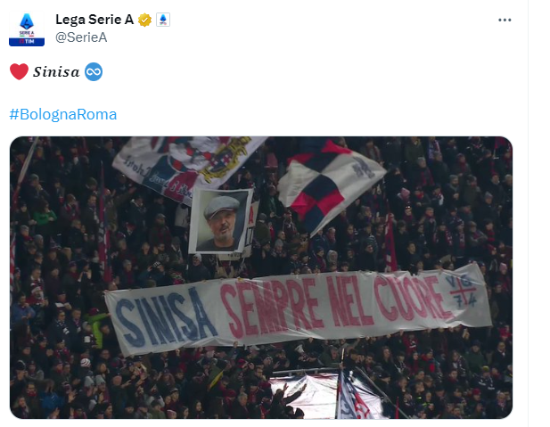 Striscione rossoblù “Sinisa per sempre” da parte dei tifosi e consegna di una foto a tutta la famiglia di Sinisa, moglie e figli, da parte del club come sottolineato dagli account della Lega Serie A.